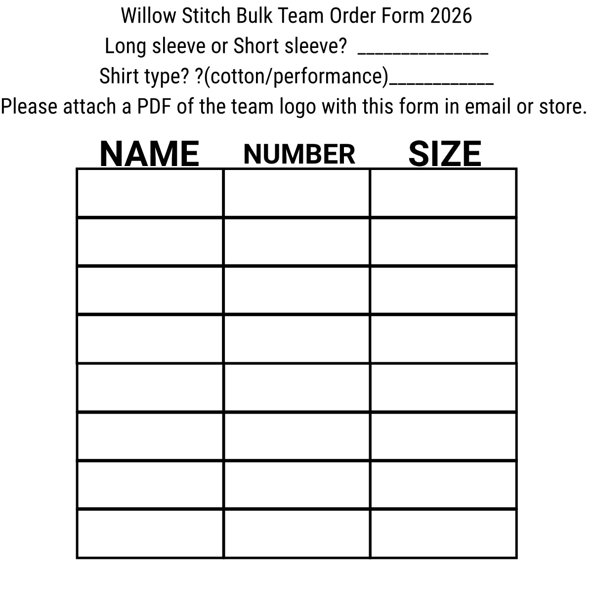 For bulk ordering and team sports apparel inquiries, please print and complete the order form shown below. Once finished, email the completed form to shopwillowstitch@gmail.com, or stop by in store and drop it off. So our team can review your details, provide accurate pricing, and assist with placing your order. This helps ensure we have all necessary information to process your request efficiently and deliver the best possible service for your team.